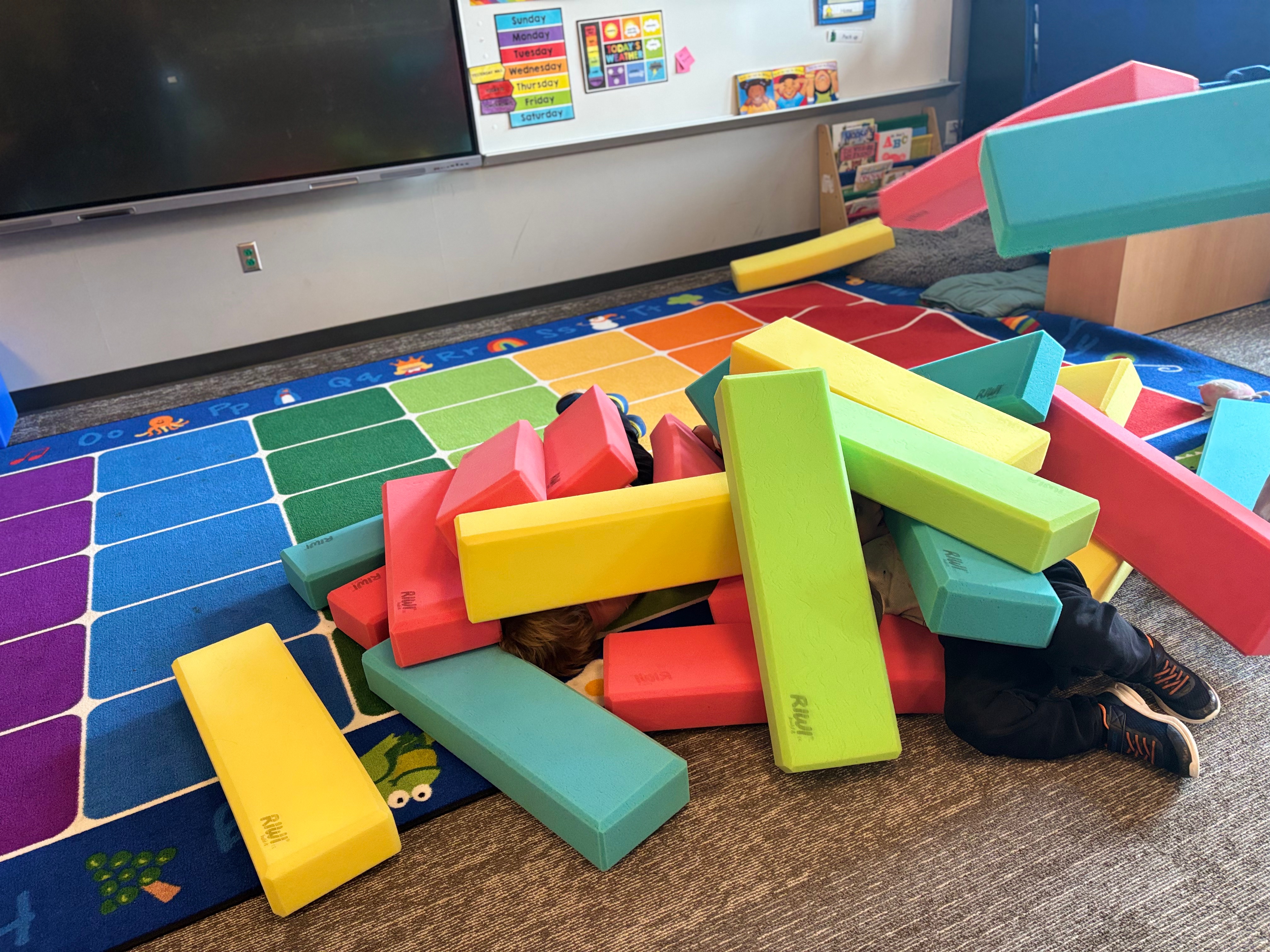 Piled under a soft mound of colorful foam blocks lies two – or is it three? – Sunnyland students. Moments ago, the room was loud and lively as the kids stacked, knocked down, and rebuilt giant structures with the blocks.